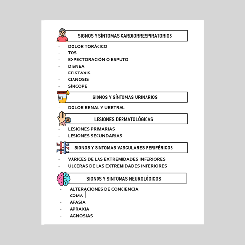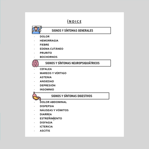 Tamaño 1/4 carta. Libreta resumen de 37 de los signos y síntomas más frecuente, junto con su semiología, características y clasificación. 160 paginas.
